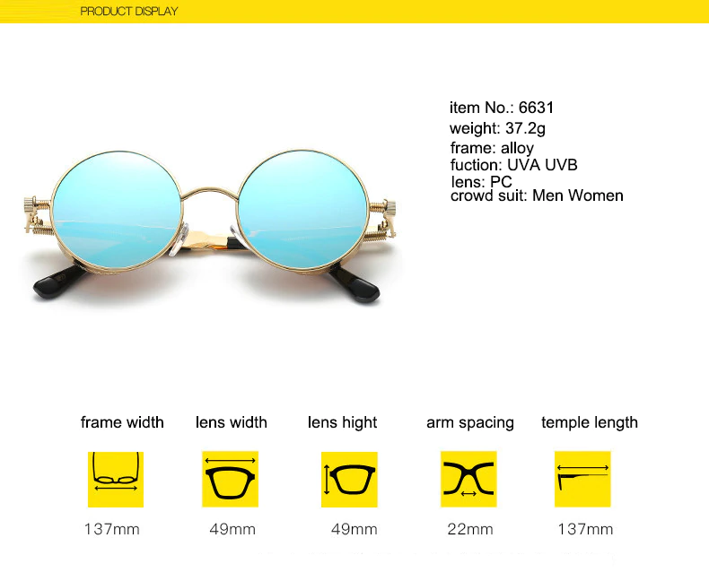 The Latest Designer New Vintage sunglasses UV 400 Model: 6631 black frames, Mirror Lens, blue tint There is one left in stock Buy It Now I will not reorder more 100% brand new Shipping in the United States. Estimated delivery time 7 to 15 days/ after payment is received Condition: New: A brand-new item, unused, unopened, undamaged item in its original packaging. The packaging was packaged by the manufacturer in non-retail packaging, such as an unprinted box or plastic bag. Gothic Steampunk Round Black Metal Frame Round Gold tint Mirror Lens mirror reflective blue tint circle sunglasses brand Designer Retro Vintage optical Women Men sunglasses UV 400 Model: 6631 black frames, Mirror Lens, blue tint [VINTAGE ROUND SUNGLASSES ] HIGH QUALITY: Retro Round Sunglasses Vintage sunglasses block 100% harmful U.V.A & U.V.B Rays, restores true color, eliminates reflected light and scattered light, protecting your eyes perfectly. INSPIRED DESIGN: This pair of sunglasses is suitable for every kind of face, With a silicone nose pad for more comfortable and less irritation on the nose We opt for a comfortable and delicate lifestyle. We design our products by using the latest materials and youthful design process. Sunglasses designed for the customer's facial features, integration of popular elements and romantic chic fashion style. Steampunk Style of Design Gothic Steampunk screws spring legs design and exquisite gothic steampunk design carved round frame Lightweight and comfortable to wear Description of the article Anti-glare, 100% UV 400 protection coating, blocks 100% harmful U V A & U V B Rays Brand Name: Proud Demon Glasses Type: Sunglasses Article Type: Glasses Lens Width: 49 MM Sex: Men Height Lens: 49 MM Optical Lens Attribute: Mirror, UV 400, Anti-Reflection Mount Material: Alloy Style: Circle Lens Hardware: Polycarbonate Model Number: 6631 black Adult Design Description: Italy Brand Design Function: 100% UV 400 Protection Against Harmful U V A / U V B Rays Certificate: UV 400, CE, FDA Color: Yellow Gold Mirror lens, blue tent, Black Frame Feature: Stylish Comfortable Mirrored Sunglasses: Polarized multiple-color mirrored sunglasses-- suitable for driving sunglasses as well as fashionable accessories. RETRO STEAMPUNK DESIGN: Classic Gothic steampunk sun glasses perfect for driving, skiing, fishing, shopping, travelling and so on 1 x polarized sunglasses Full Refund if you don't receive your order. At the time of purchase double-check your shipping information we do not want an item to go someplace else. We mail on the information you supply to us in the shipping purchase forms Thank you for understanding! For additional information read or Returns policy and Refunds
