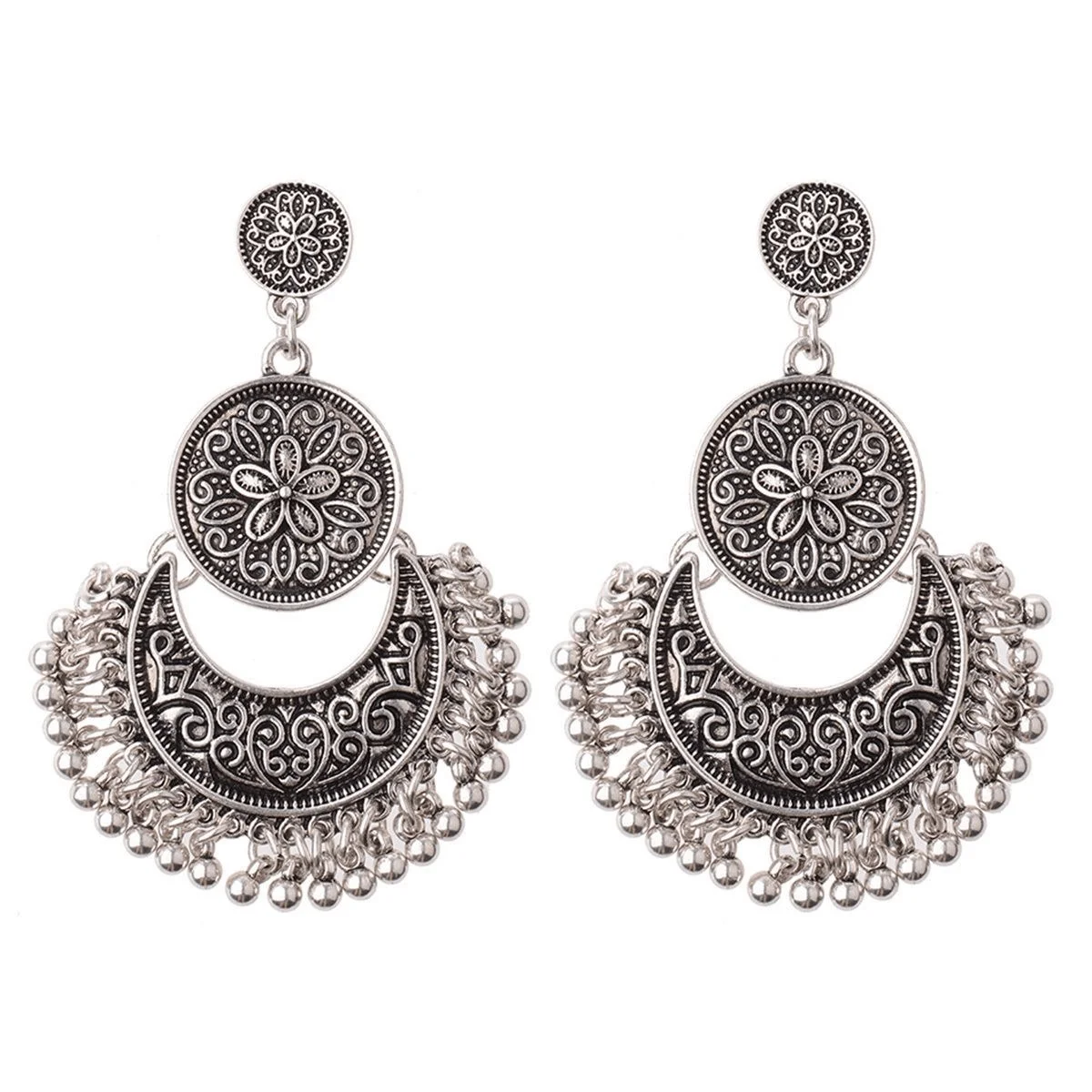Women's Vintage Silver Carved Flower Tassel Stud Earring